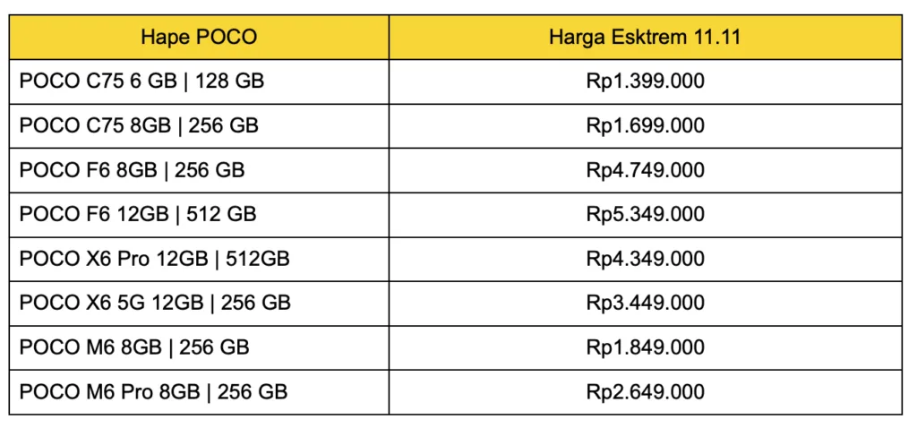 Jeksen, Product Marketing Manager POCO Indonesia, mengungkapkan, “Sudah menjadi komitmen POCO, sebagai brand teknologi yang digemari oleh anak-anak muda, buat menghadirkan pilihan produk dengan performa dan harga paling ekstrem. Lewat Promo 11.11 ini, POCO ngasih kesempatan bagi para POCO Fans untuk dapetin produk-produk unggulan dengan harga terbaik, mulai dari entry-level sampai produk flagship kami. Jadi jangan ketinggalan!”